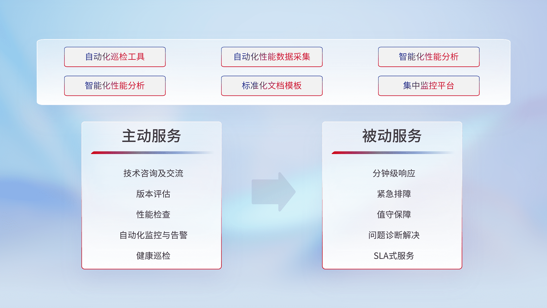 智能化工具和标准化文档,,保障服务质量,,提供主动服务(包含技术咨询、、、版本评估、、、性能检查、、、自动化监控与告警、、、健康巡检)和被动服务包含(分钟级响应、、、、紧急排障、、、值守保障、、、、问题诊断解决、、、、SLA服务)。。。