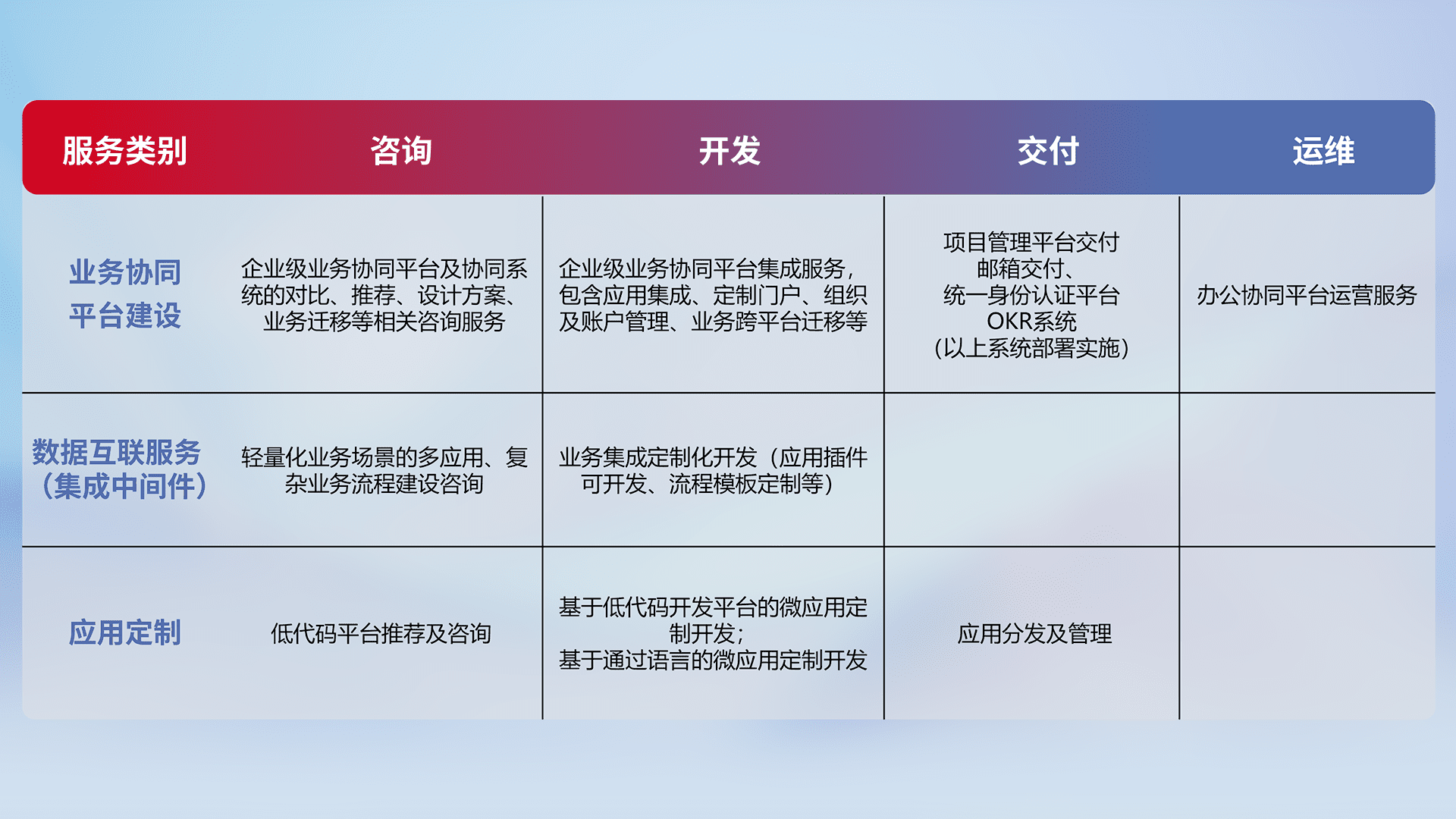 针对钉钉、、企微、、IDaas等平台级产品提供产品的规划、、、、方案、、交付、、、定制化开发等服务,,,,实现如统一协同办公、、、智能客户服务、、混合会议管理、、、、智能数据查询、、等业务场景,,,实现数字化转型。。。